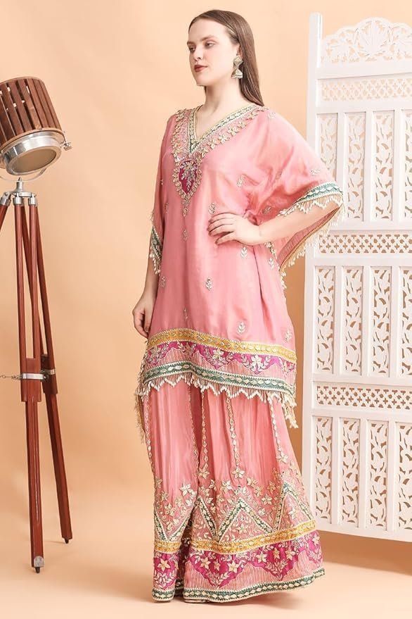 Traditional Embroidered Kaftan Palazzo Set, Pink, V-Neck with Fringe Details, Floral Embellished