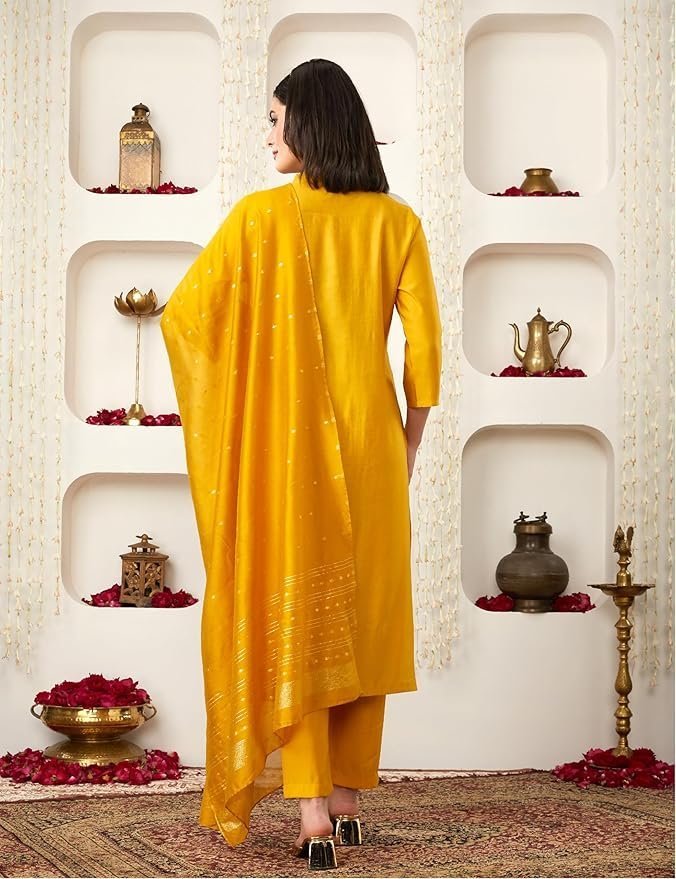 - This elegant 3-piece salwar suit set features a regular-fit kurta with exquisite zari-embroidery & gold metal button placket, straight-fit pyjama and dupatta featuring gold jacquard motifs.